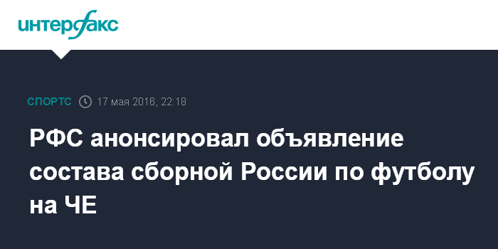 "Состав сборной России будет объявлен вечером в субботу 21 мая, после окончания матчей заключительного, 30-го тура чемпионата России, или в воскресенье 22 мая. Список футболистов будет опубликован на официальном сайте РФС. Проведение пресс-конференции на эту тему ни 21 мая, ни 22 мая не планируется", - сказал Владимиров.