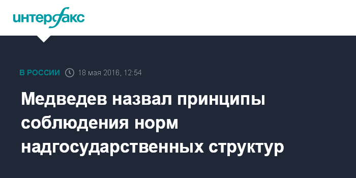 Москва. 18 мая. INTERFAX.RU - Глава российского правительства Дмитрий Медведев считает, что при реализации правовых норм надгосударственных структур должны учитываться интересы России.