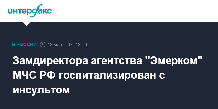 Замдиректора агентства "Эмерком" МЧС РФ госпитализирован с инсультом