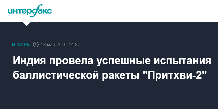 Москва. 18 мая. INTERFAX.RU - Индия успешно испытала в среду ракету "Притхви-2", способную нести ядерный боезаряд, сообщает F.India.