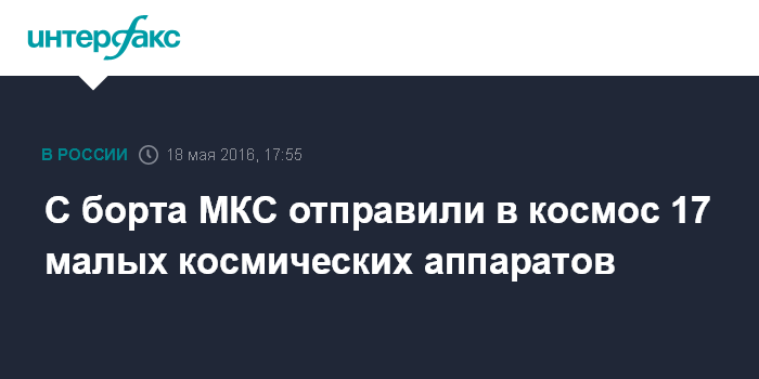 "В период с 16 по 18 мая с борта МКС с помощью японского дистанционного манипулятора JEM RMS и пусковой платформы компании NanoRacks запущено 17 малых спутников, на борту станции в ожидании запуска остаются 26 таких космических аппаратов, включая российский аппарат "Томск-ТПУ-120", - сказал источник.