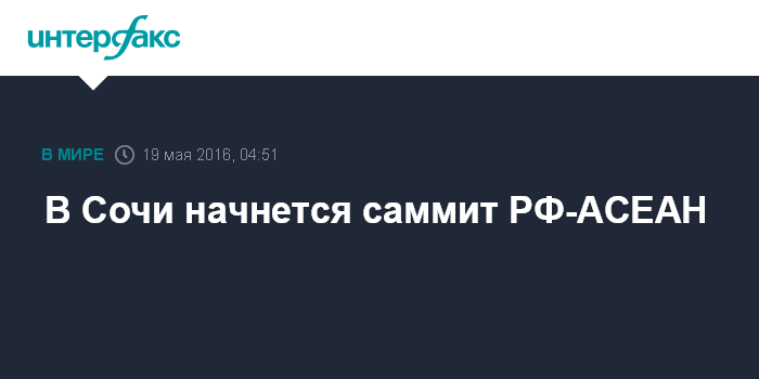 Москва. 19 мая. INTERFAX.RU - В Сочи стартует саммит Россия-АСЕАН, от которого в Москве ожидают импульса для выведения этого партнёрства на новый стратегический уровень.