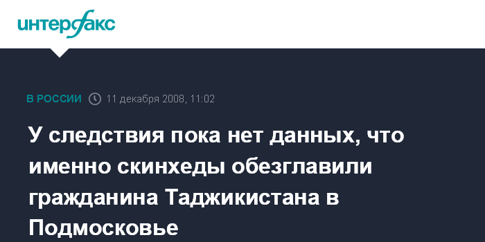 Ранее источник в правоохранительных органах сообщил "Интерфаксу", что голова убитого таджика была обнаружена завернутой в полиэтиленовый пакет в мусорном контейнере на западе Москвы рядом со зданием управы столичного района "Можайский" на западе Москвы.