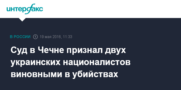 Москва. 19 мая. INTERFAX.RU - Суд присяжных в Чечне признал виновными членов украинской националистической организации УНА-УНСО Николая Карпюка и Станислава Клыха, сообщил "Интерфаксу" официальный представитель СКР Владимир Маркин.