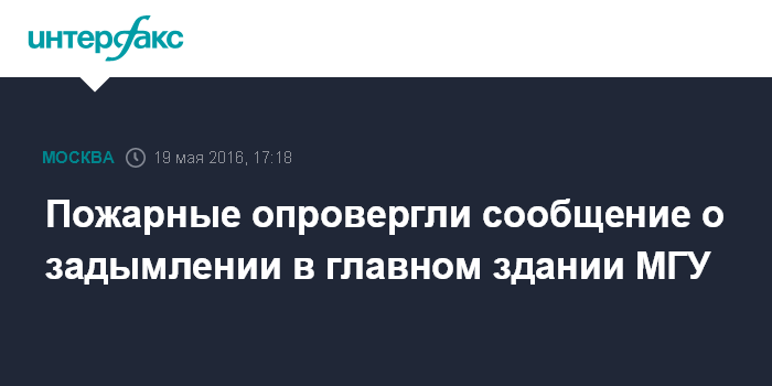 Москва. 19 мая. INTERFAX.RU - Информация о возгорании в главном корпусе МГУ оказалась ложной, сообщили "Интерфаксу" в пресс-службе столичного главка МЧС.