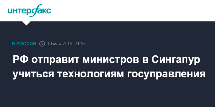 Москва. 19 мая. INTERFAX.RU - Руководители федеральных министерств и их заместители в этом году пройдут обучение в Сингапуре в области госуправления.