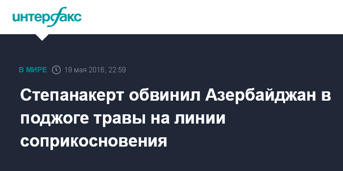 Москва. 19 мая. INTERFAX.RU - Министерство обороны непризнанной Нагорно-Карабахской республики (НКР) обвинило азербайджанскую сторону в умышленном поджоге травяного покрова на нейтральных участках в приграничной зоне, в частности, в восточном направлении линии соприкосновения.