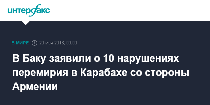 Москва. 20 мая. INTERFAX.RU - Вооруженные силы Армении 10 раз за минувшие сутки нарушили режим прекращения огня на линии соприкосновения сторон в зоне конфликта, сообщает в пятницу пресс-служба Министерства обороны Азербайджана.