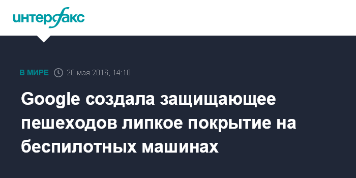Москва. 20 мая. INTERFAX.RU - Google запатентовала липучее покрытие для самоуправляемых автомашин, которое способно уменьшить ущерб, наносимый пешеходам при столкновении.