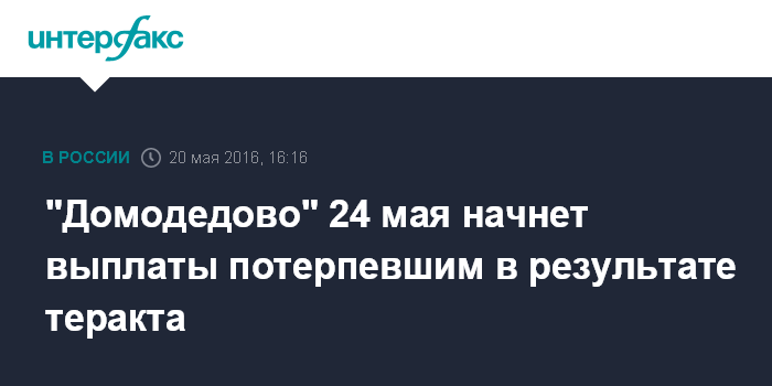 Москва. 20 мая. INTERFAX.RU - Руководство аэропорта "Домодедово" с 24 мая начинает выплаты потерпевшим по делу о теракте в 2011 году, сообщил представитель потерпевших, адвокат Игорь Трунов.