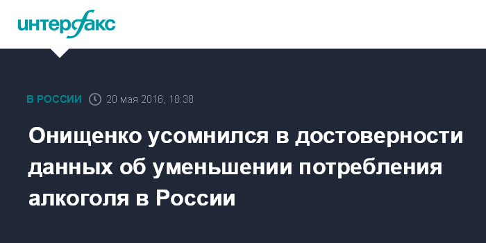 Москва. 20 мая. INTERFAX.RU - Помощник председателя правительства РФ Геннадий Онищенко усомнился в достоверности информации о снижении потребления алкоголя в России.
