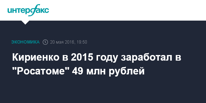 Москва. 20 мая. INTERFAX.RU - Доходы главы ГК "Росатом" Сергея Кириенко по основному месту работы за 2015 год составили 49,2 млн рублей, сообщила госкорпорация.