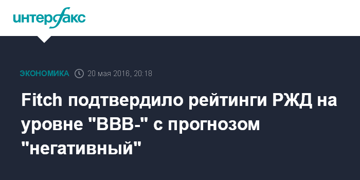 Москва. 20 мая. INTERFAX.RU - Международное рейтинговое агентство Fitch подтвердило долгосрочные рейтинги дефолта эмитента (РДЭ) ОАО "РЖД" (MOEX: RZHD) в иностранной и национальной валюте на уровне "BBB-", сообщается в пресс-релизе агентства.