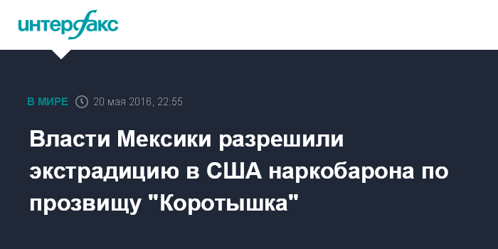Москва. 20 мая. INTERFAX.RU - Правительство Мексики в пятницу разрешило провести экстрадицию в США главаря крупного наркокартеля "Синалоа" Хоакина Гусмана по прозвищу "Коротышка", сообщают американские СМИ.