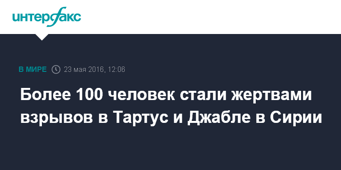 Москва. 23 мая. INTERFAX.RU - Свыше 100 человек погибли в результате нескольких взрывов в сирийских городах Тартус и Джабла, пишут в понедельник западные СМИ.