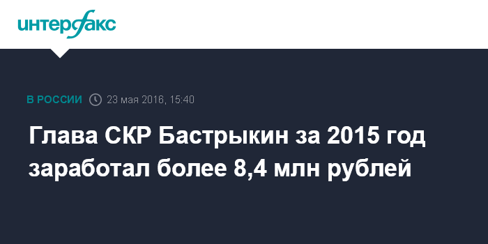 Согласно опубликованным на сайте Следственного комитета сведениям о доходах сотрудников ведомства, доход Бастрыкина за 2015 год составил 8 млн 417 тыс. 196 рублей 45 копеек. Супруга председателя СКР в прошлом году получила доход на сумму 3 млн 852 тыс. 974 руб. 21 коп.