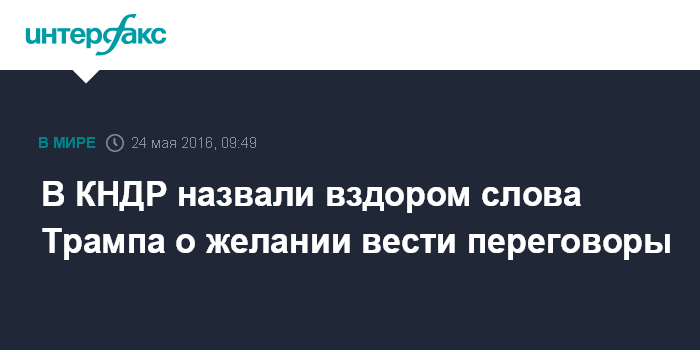 Москва. 24 мая. INTERFAX.RU - В руководстве КНДР назвали вздорным заявление претендента на пост президента США Дональда Трампа о планах в случае избрания начать переговоры с лидером КНДР Ким Чен Ыном, сообщает во вторник французская газета Le Figaro.