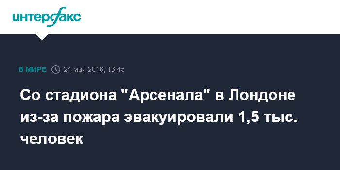 Москва. 24 мая. INTERFAX.RU - Около 1,5 тысячи человек, находившихся на лондонском стадионе "Эмирейтс", были эвакуированы после объявления пожарной тревоги, сообщает во вторник сайт британской газеты Daily Star.