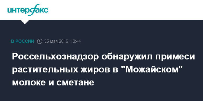 Москва. 25 мая. INTERFAX.RU - Управление Россельхознадзора по Москве, Московской и Тульской областям выявило факты разбавления молочной продукции растительными жирами на заводе стерилизованного молока "Можайский", сообщили в пресс-службе ведомства в среду.