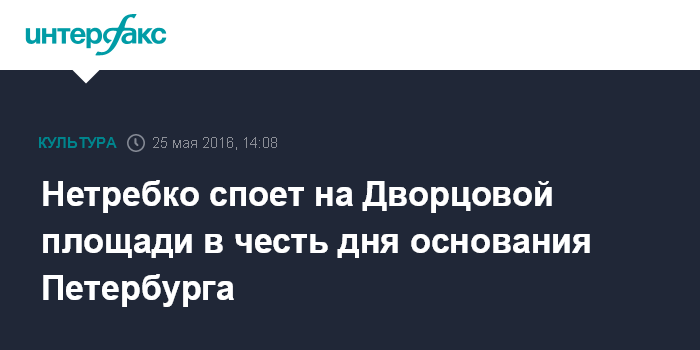 Москва. 25 мая. INTERFAX.RU - Петербург в пятницу, 27 мая, отметит 313 лет со дня основания города большим концертом классической музыки на Дворцовой площади с участием народной артистки РФ Анны Нетребко.