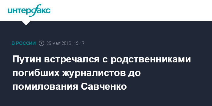 Москва. 25 мая. INTERFAX.RU - Подписанию указа о помиловании Савченко предшествовала встреча президента РФ Владимир Путина с родственницами погибших российских журналистов, в гибели которых она обвинялась, сообщил пресс-секретарь российского президента Дмитрий Песков.
