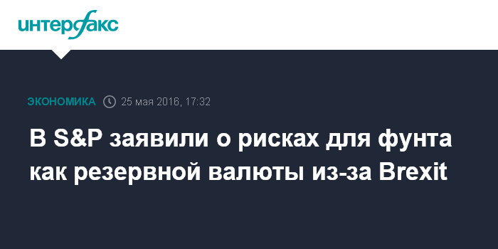 Москва. 25 мая. INTERFAX.RU - Выход Великобритании из состава Европейского союза (Brexit) может оказать негативное влияние на статус фунта стерлингов как мировой резервной валюты, полагают аналитики международного рейтингового агентства Standard & Poor's Global Ratings.