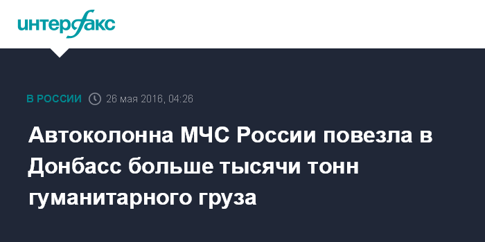 Москва. 26 мая. INTERFAX.RU - МЧС России направило в Донбасс 52-ю автоколонну с гуманитарной помощью для жителей Донецкой и Луганской областей, сообщили в пресс-службе ведомства.