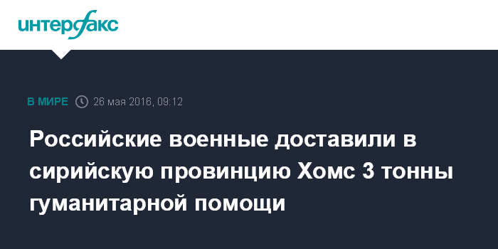 Москва. 26 мая. INTERFAX.RU - Около 3 тонн гуманитарной помощи доставили российские военные в сирийскую провинцию Хомс, сообщил журналистам представитель российского Центра по примирению враждующих сторон в Сирии.