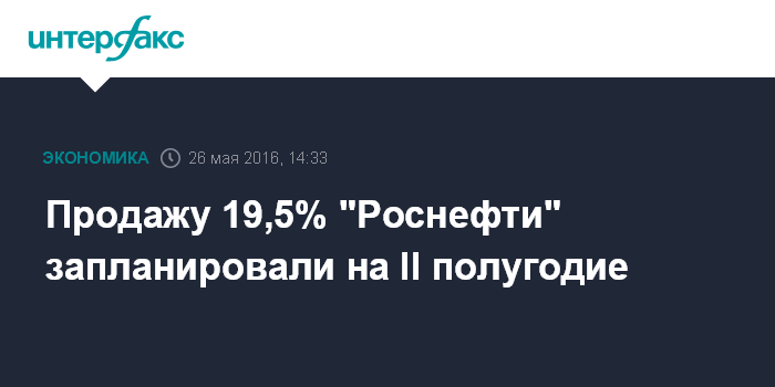 "Реализация 19,5% акций "Роснефти" ожидается во второй половине текущего года. Отобраны компании, которые будут заниматься этим проектом (инвестконсультанты - ИФ). Поэтому я здесь не вижу никаких изменений в тех решениях, которые были приняты", - описал свои ожидания в отношении сроков продажи "Роснефти" министр финансов.
