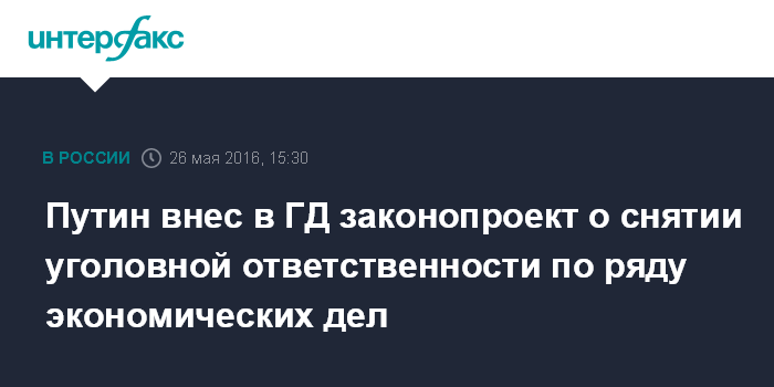 Москва. 26 мая. INTERFAX.RU - Президент РФ Владимир Путин внес в Госдуму законопроект, который позволяет расширить сферу применения статьи Уголовного кодекса (УК) РФ об освобождении от уголовной ответственности по делам о преступлениях в сфере экономической деятельности. Текст документа опубликован в электронной базе документов нижней палаты парламента.