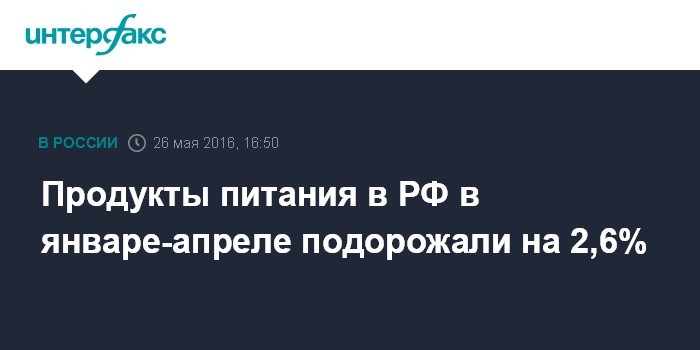 Москва. 26 мая. INTERFAX.RU - Рост цен на продукты питания в РФ за январь-апрель 2016 года составил 2,6%, в то время как в ЕС продовольствия стало дороже всего на 0,6%, следует из данных Федеральной службы госстатистики (Росстат).