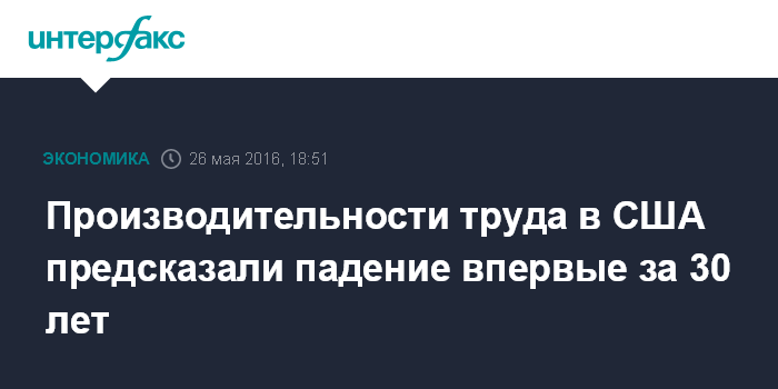 Москва. 26 мая. INTERFAX.RU - Производительность труда в США в 2016 году может упасть впервые более чем за 30 лет, прогнозирует исследовательская организация Conference Board.