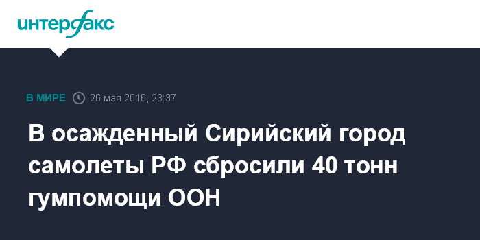 Москва. 26 мая. INTERFAX.RU - Несколько десятков тонн гуманитарной помощи доставлено жителям сирийского города, который осажден боевиками ИГИЛ (террористическая группировка, запрещена в РФ), сообщили в Минобороны РФ.