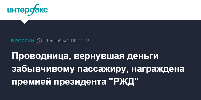 "Забывчивого пассажира довольно быстро нашли и вернули ему сумку с деньгами. Все до копейки было на месте. Забрав свой багаж, пассажир удалился, даже не сказав слов благодарности. Руководство компании решило исправить эту несправедливость и поощрить честную проводницу", - говорится в сообщении пресс-службы.