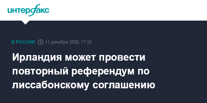Москва. 11 декабря. INTERFAX.RU - Ирландия готова провести второй референдум по вопросу об одобрении лиссабонского соглашения ЕС в случае, если получит от ЕС гарантии по неучастию Ирландии в европейской оборонной политике, неучастию в планах гармонизации налогообложения на общеевропейском уровне и сохранению запрета на аборты в стране, сообщает в четверг британская телерадиокорпорация BBC.
