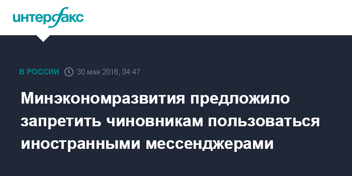 Москва. 30 мая. INTERFAX.RU - Минэкономики 26 мая внесло доклад по приоритету закупок российского программного обеспечения и оборудования президенту РФ Владимиру Путину, ведомство предлагает запретить чиновникам и военнослужащим вести рабочую переписку через мобильные приложения иностранных разработчиков, пишет в понедельник газета "Коммерсант", ссылаясь на имеющуюся копию документа.