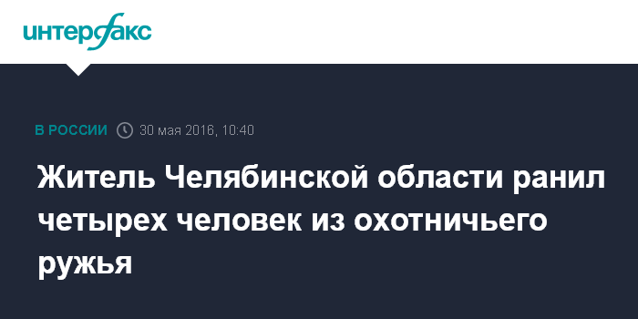 Москва. 30 мая. INTERFAX.RU - Четыре человека накануне получили ранения в результате стрельбы из охотничьего ружья в поселке Вахрушево Челябинской области, сообщили агентству "Интерфакс" в пресс-службе регионального ГУ МВД РФ в понедельник.