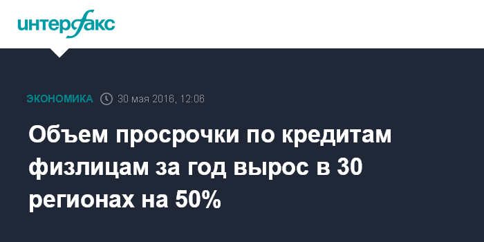 Москва. 30 мая. INTERFAX.RU - Объем просроченной задолженности по розничным кредитам на конец первого квартала 2016 года вырос более чем на 50% в сравнении с аналогичным показателем на конец первого квартала 2015 года в 30 регионах РФ, говорится в обзоре "Объединенного кредитного бюро" (ОКБ).