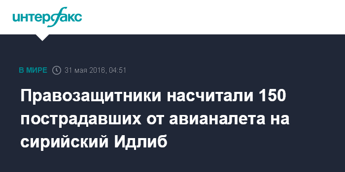 Москва. 31 мая. INTERFAX.RU - В результате авианалетов на город Идлиб на северо-западе Сирии погибли и получили ранения не менее 150 человек, сообщил Наблюдательный совет по правам человека в Сирии, базирующийся в Лондоне.