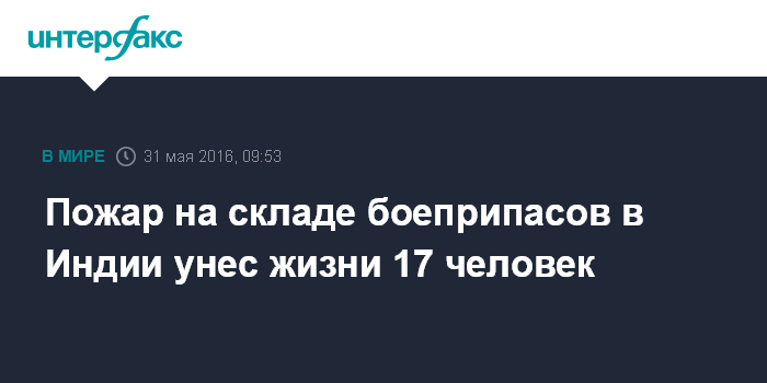 Москва. 31 мая. INTERFAX.RU - В результате пожара на складе боеприпасов в индийском городе Пулгаон (штат Марахаштра) погибли 17 человек, пишет во вторник газета The Times of India со ссылкой на данные министерства обороны Индии.