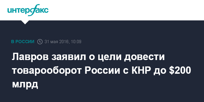 Москва. 31 мая. INTERFAX.RU - Россия считает достижимой цель довести товарооборот с Китаем до 200 млрд долларов, заявил глава МИД РФ Сергей Лавров.