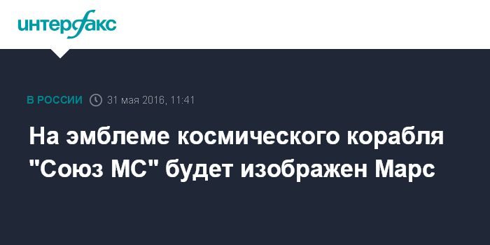 Москва. 31 мая. INTERFAX.RU - Эмблемой космического корабля "Союз МС", который стартует с космодрома "Байконур" 24 июня, стали цифры 01 и изображение планеты Марс, сообщил командир корабля, космонавт Анатолий Иванишин.