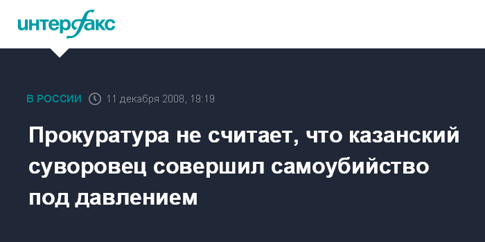 Москва. 11 декабря. INTERFAX.RU - В Татарстане прокуратура отменила как необоснованное решение о возбуждении уголовного дела в связи с гибелью воспитанника Казанского суворовского военного училища; расследование продолжается.
