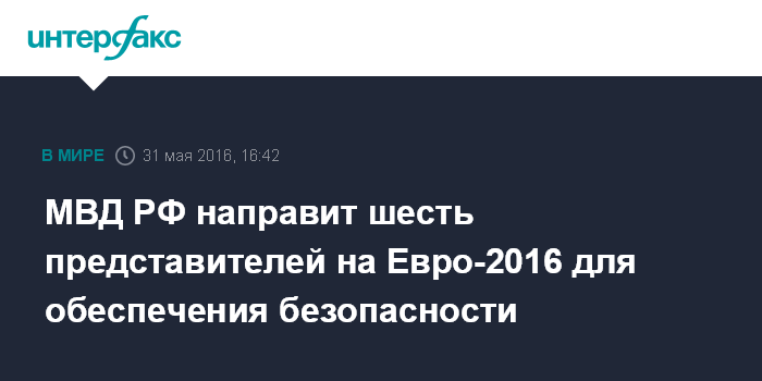 Москва. 31 мая. INTERFAX.RU - Шесть представителей российского МВД отправятся во Францию для обеспечения безопасности во время Евро-2016, сообщили "Интерфаксу" в пресс-центре МВД РФ.