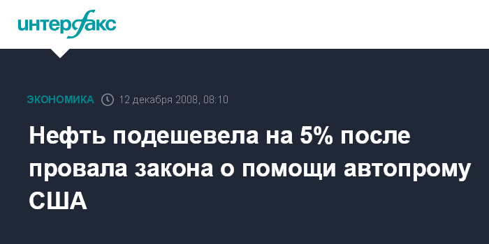 Москва. 12 декабря. INTERFAX.RU - Фьючерсы на нефть подешевели в пятницу на 5% и достигли на Нью-йоркской товарной бирже $45,52 за баррель после провала в Сенате закона о помощи автопрому США, сообщает агентство Bloomberg.