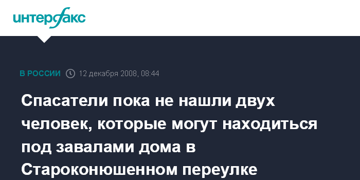 Москва. 12 декабря. INTERFAX.RU - На месте обрушения перекрытий в доме N45 по Староконюшенному переулку продолжается разбор завалов, однако специалисты МЧС пока не обнаружили двух людей, которые с большой долей вероятности остаются под обрушившимися конструкциями, сообщил "Интерфаксу" источник в правоохранительных органах в пятницу.