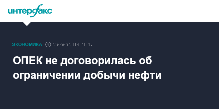 Москва. 2 июня. INTERFAX.RU - Организация стран-экспортеров нефти (ОПЕК) не сумела достичь соглашения о новом потолке добычи нефти, сообщает агентство Bloomberg со ссылкой на пожелавшего остаться неизвестным делегата в Вене.