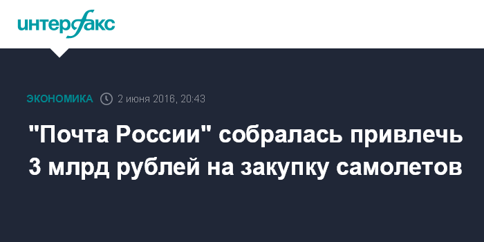 Москва. 2 июня. INTERFAX.RU - ФГУП "Почта России" планирует привлечь 3 млрд рублей на приобретение воздушных судов, следует из документов закупки компании.