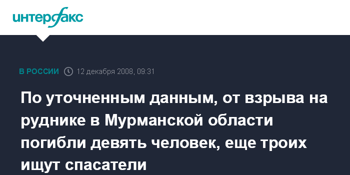 Москва. 12 декабря. INTERFAX.RU - В результате взрыва на Расвумчоррском руднике в Мурманской области погибли девять человек, пострадали четыре человека, судьба еще трех человек неизвестна, сообщил "Интерфаксу" сотрудник пресс-службы областного МЧС.