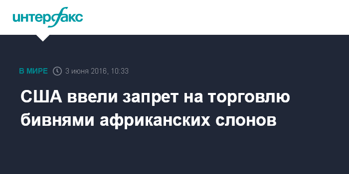 Москва. 3 июня. INTERFAX.RU - Власти США ввели почти полный запрет на торговлю африканской слоновой костью на внутреннем рынке, передает "Би-би-си".